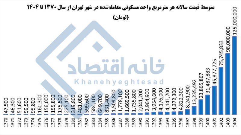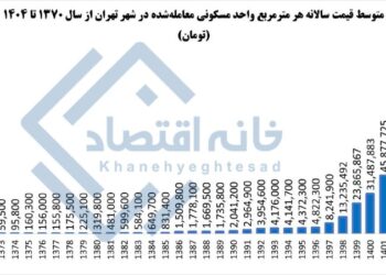 بانک مرکزی و وزارت راه و شهرسازی نشان میدهد میانگین قیمت هرمترمربع واحد مسکونی معاملهشده در شهر تهران از حدود ۴۷ هزار تومان در سال ۱۳۷۰ به حدود ۹۸ میلیون تومان تا پایان سال ۱۴۰۳ رسیده است.