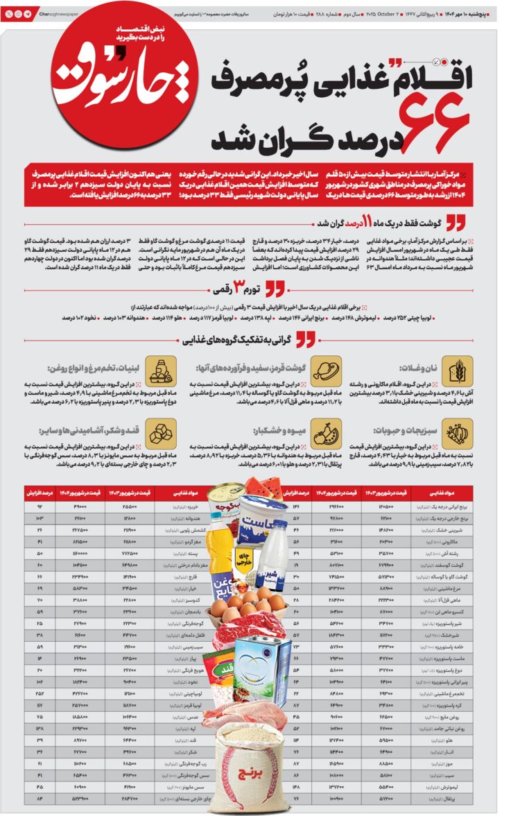 این گرانی شدید در حالی رقم خورده که متوسط افزایش قیمت همین اقلام غذایی در یک سال پایانی دولت شهید رئیسی فقط ۳۳ درصد بود؛ یعنی هماکنون افزایش قیمت اقلام غذایی پرمصرف نسبت به پایان دولت سیزدهم ۲ برابر شده و از ۳۳ درصد به ۶۶ درصد افزایش یافته است.