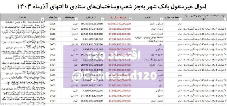 این آمار نشان میدهد گرانترین ملک در اختیار بانک شهر مربوط به یک هتل به ارزش بیش از ۵۳ همت است. پس از آن، یک ملک به ارزش حدود ۱۰همت و در رتبه سوم، چهارم، پنجم و ششم نیز املاکی به ارزش ۸/۳ همت، ۷/۶ همت، ۴/۶ و ۴ همت است.