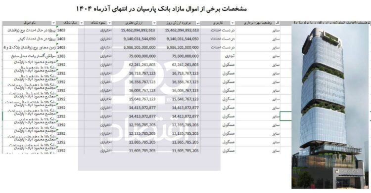 به گزارش «اقتصاد ۱۲۰» طبق دادههای منتشر شده از سوی بانک مرکزی، بانک پارسیان در لیست اموال غیرمنقول مازاد خود دو ساختمان درحال احداث دارد که اولی برج زرافشان تهران و دومی ساختمانی در جزیره کیش است.