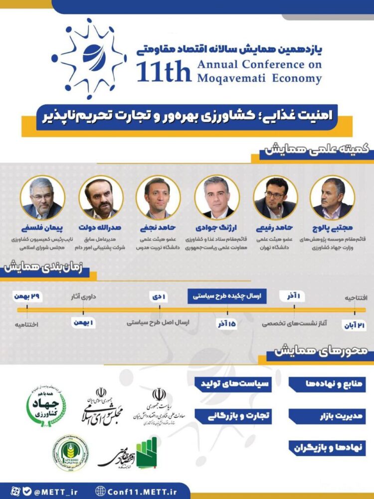 به گزارش «اقتصاد ۱۲۰» در ادامه برگزاری ده همایش سالانه اقتصاد مقاومتی، یازدهمین همایش سالانه اقتصاد مقاومتی با موضوع «امنیت غذایی؛ کشاورزی بهرهور و تجارت تحریمناپذیر » در سال جاری برگزار خواهد شد. این همایش سالانه که معتبرترین رویداد اقتصاد مقاومتی در کشور است، توسط اندیشکده اقتصاد مقاومتی با همکاری دیگر نهادها و دستگاه های اجرایی و سیاستگذاری برگزار میشود.