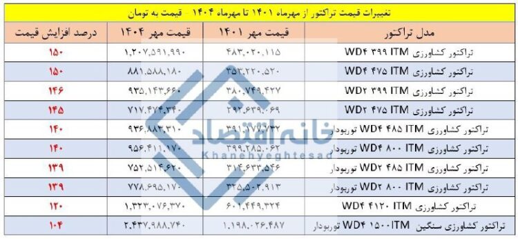 به گزارش «خانه اقتصاد» شرکت تراکتورسازی اواسط مردادماه قیمتهای جدید تراکتور را ابلاغ کرده است. بررسی روند سه ساله قیمت تراکتور نشان میدهد از مهرماه سال ۱۴۰۱ تا مهرماه ۱۴۰۴ قیمت کارخانهای تراکتور بهطور میانگین بین ۲/۴ تا ۲/۵ برابر شده است.