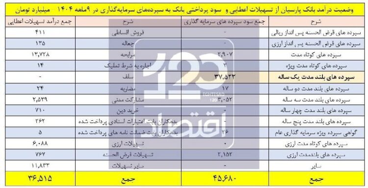 قابل ذکر است از مجموع ۴۵/۷ همت سود پرداختی بانک پارسیان به سپردهها، حدود ۸۲ درصد معادل ۳۷/۵ همت مربوط به سود پرداختی به سپردههای یکساله بوده است.
