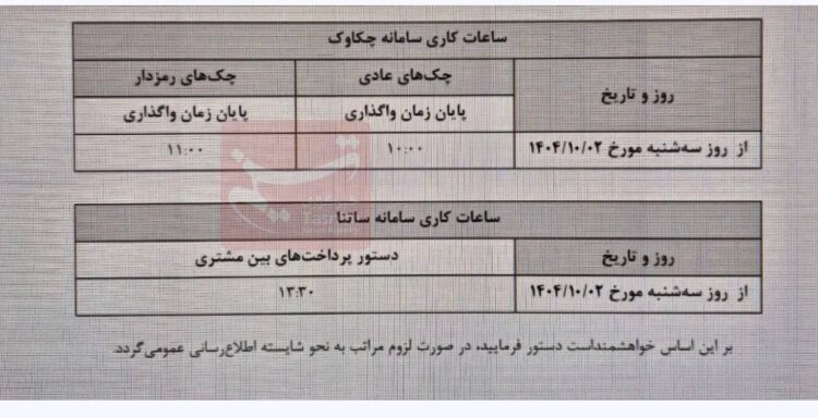 همچنین پایان زمان واگذاری چکهای عادی ساعت ۱۰ و پایان زمان واگذاری چکهای رمزدار ساعت ۱۱ هر روز خواهد بود.
