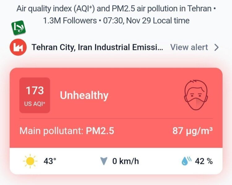 شاخص آلودگی تهران در ساعات اولیه صبح با ۱۷۳ ناسالم برای همه گروه‌های جامعه است