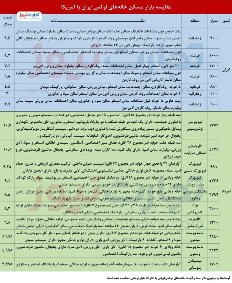 بررسیها نشان میدهد که امکانات خانه های لوکس در آمریکا به مراتب بسیار بیشتر از ایران است و حتی سطح رفاهی واحدهای یک میلیون دلاری در ایالات متحده از واحدهای لوکس ۱۰ میلیون دلاری در تهران فراتر میرود.