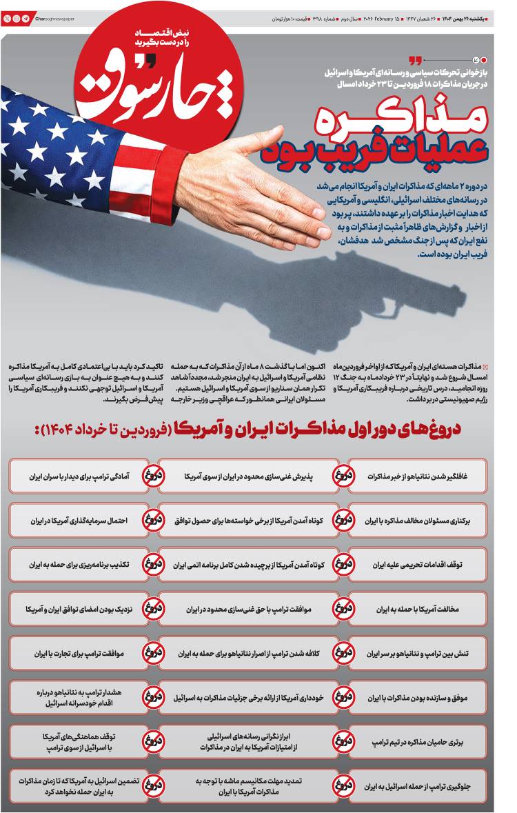 روزنامه چارسوق: در دوره ۲ ماههای که مذاکرات ایران و آمریکا انجام میشد، در رسانههای مختلف اسرائیلی، انگلیسی و آمریکایی که هدایت اخبار مذاکرات را بر عهده داشتند، پر بود از اخبار و گزارشهای ظاهراً مثبت از مذاکرات و به نفع ایران که پس از جنگ مشخص شد هدفشان، فریب ایران بوده است.
