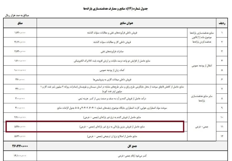 محاسبات نشان میدهد که بنا بر لایحه بودجه ۱۴۰۵، حدود ۴/۵ میلیارد دلار منابع حاصل از فروش بنزین وارداتی به نرخ غیریارانهای با توجه به نرخ ارز تالار دوم است.