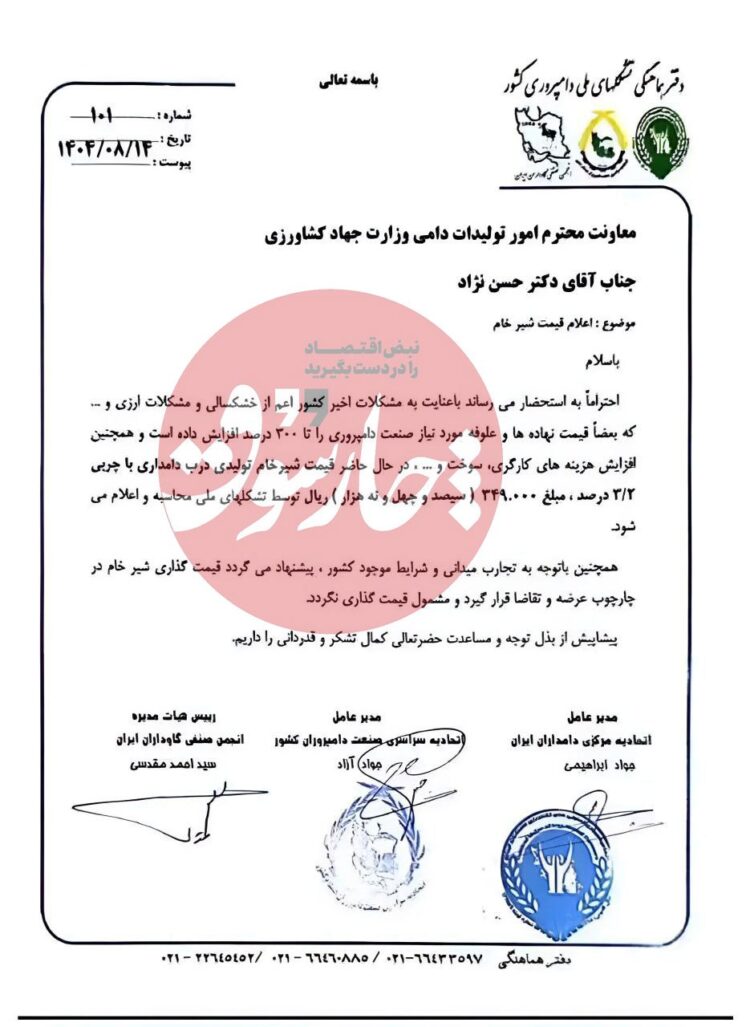لازم به ذکر است قیمت مصوب شیرخام تاکنون ۲۳۰۰۰ تومان بود و با توجه به درخواست اتحادیههای دامپروری، قیمت شیرخام حداقل ۵۰ درصد گران شده است که تاثیر خود را بر لبنیات میگذارد./ قیمت شیر خام به ۳۴۹۰۰ تومان افزایش یافته است