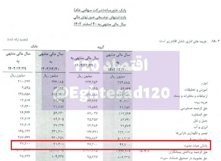 به گزارش «اقتصاد ۱۲۰» براساس صورت مالی سال ۱۴۰۳ بانک خاورمیانه، اعضای هیاتمدیره این بانک برای عملکرد سال مالی ۱۴۰۳ رقم ۳ میلیارد و ۱۴۰ میلیون تومان پاداش دریافت کردهاند. پاداش هیاتمدیره خاورمیانه در سال ۱۴۰۲ نیز ۳ میلیارد و ۷۲۰ میلیون تومان بوده است.