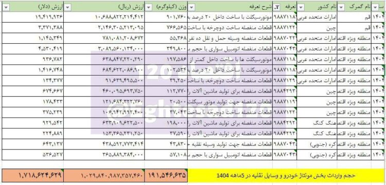 به گزارش «اقتصاد ۱۲۰» براساس آمارهای گمرک ایران، مونتاژکاران خودرو و وسایل نقلیه در ۵ماهه نخست امسال ۱ میلیارد و ۷۱۹ میلیون دلار واردات داشتهاند که ۲۴۵ میلیون دلار معادل ۱۴ درصد مربوط به قعطات مونتاژ موتورسکلت و نزدیک به ۱/۵ میلیارد دلار معادل ۸۶ درصد از آن مربوط به واردات قطعات خودرو بوده است.