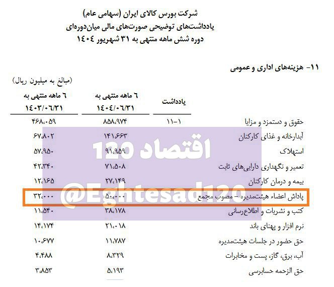 به گزارش «اقتصاد ۱۲۰» براساس صورت مالی ۶ماهه نخست سال جاری، در جلسه مجمع عمومی بورس کالا رقم ۵ میلیارد تومان برای پاداش اعضای هیئتمدیره این نهاد در نظر گرفته شده که نسبت به رقم ۳ میلیارد و ۲۰۰ میلیونی مدت مشابه سال گذشته رشد ۵۶ درصدی داشته است.