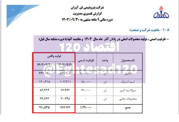 به گزارش «اقتصاد ۱۲۰» براساس گزارش ۹ماهه شرکت پتروشیمی فنآوران، این شرکت زیرمجموعه شستا در ۹ماهه امسال حدود ۷۷۲ هزار تن انواع محصولات پتروشیمی (متانول، اسید استیک، منواکسید کربن و محصولات جانبی) تولید کرده که نسبت به تولید ۹۱۰ هزار تنی مدت مشابه سال گذشته کاهش ۱۵/۲ درصدی را تجربه کرده است.
