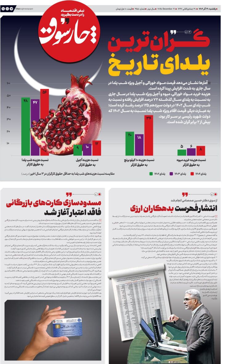 هزینه خرید مواد خوراکی، میوه و آجیل ویژه شب یلدا در سال جاری به نسبت به یلدای سال گذشته ۷۲ درصد افزایش یافته و نسبت به شب یلدای سال ۱۴۰۲ در دولت سیزدهم ۱۲۵ درصد رشد کرده است؛ به عبارت دیگر، قیمت اقلام ویژه شب یلدا نسبت به سال ۱۴۰۲ که دولت شهید رئیسی بر سر کار بود، بیش از ۲ برابر گران شده است.