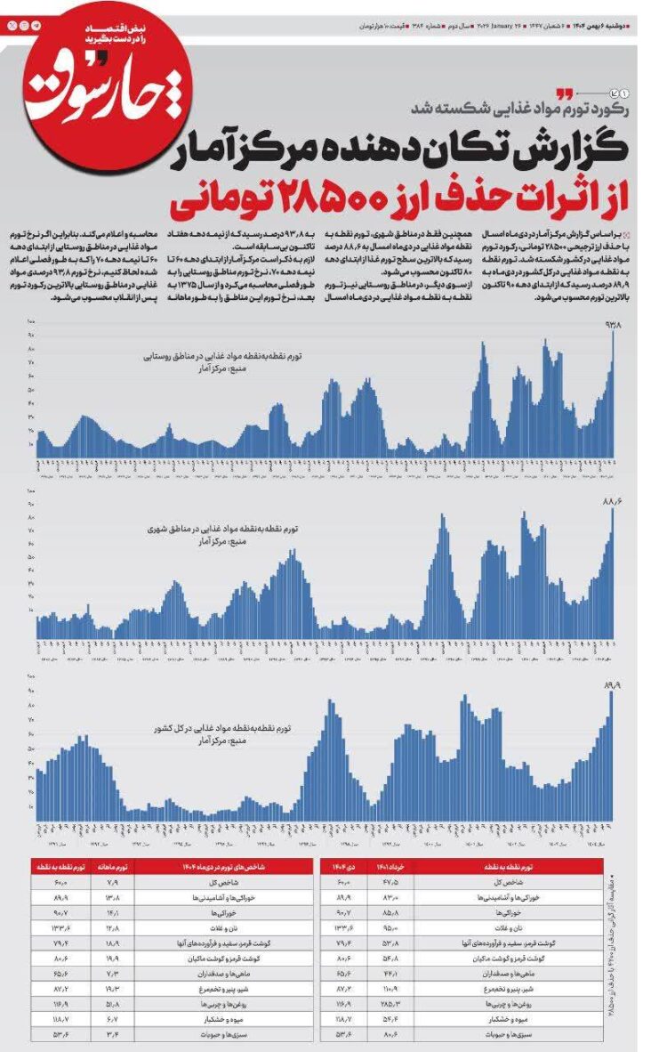 از سوی دیگر، در مناطق روستایی نیز تورم نقطه به نقطه مواد غذایی در دیماه امسال به ۹۳.۸ درصد رسید که از نیمه دهه هفتاد تاکنون بیسابقه است.