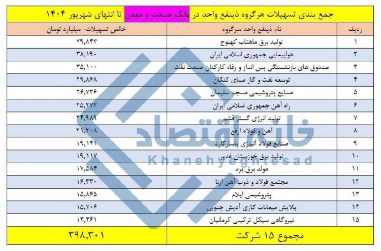 همچنین از رقم ۷۷۸ همت، بیش از ۳۹۸ همت از آن در اختیار ۱۵ شرکت بوده که معادل ۵۱ درصد از کل تسهیلات ذینفع واحد این بانک است.