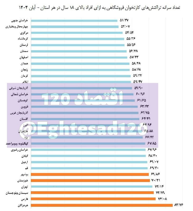 براساس این آمار، هرمزگان با نزدیک ۸۴ تراکنش کارتخوان فروشگاهی بهازای هر فرد بزرگسال در رتبه اول کشور قرار دارد. استان فارس با ۷۴ تراکنش دوم بوده، سیستانوبلوچستان با حدود ۷۳ تراکنش در رتبه سوم قرار داشته و تهران با ۷۲ تراکنش چهارم است.