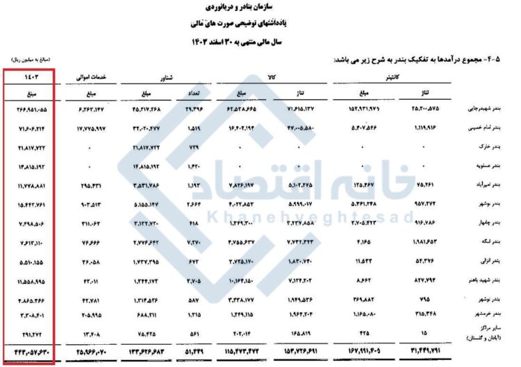 به گزارش «خانه اقتصاد» براساس صورت مالی سازمان بنادر و دریانوردی ایران، طی سال ۱۴۰۳ درآمد عملیاتی این سازمان حدود ۴۴ هزار و ۳۰۵ میلیارد تومان بوده که حدود ۳۳/۸ همت از آن یا معادل ۷۶/۴ درصد از کل درآمد بنادر، مربوط به درآمد بندر شهید رجایی و بندر امام خمینی (ره) بوده است.