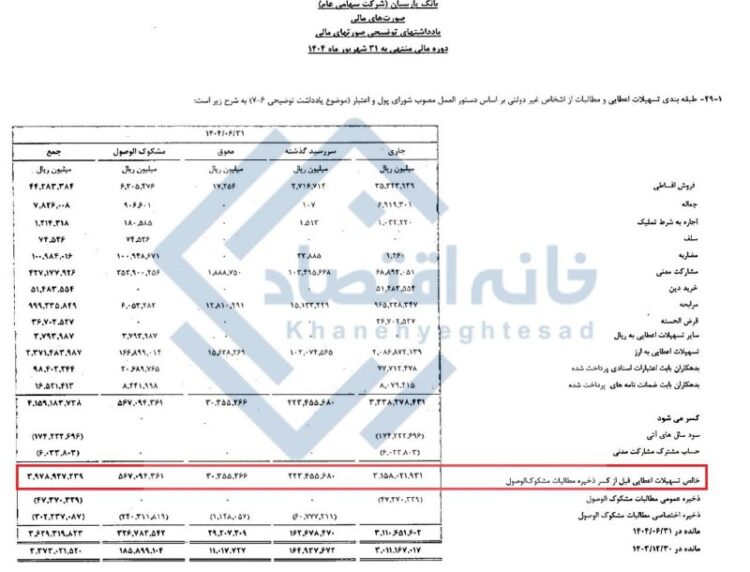 به گزارش «خانه اقتصاد» براساس صورت مالی منتهی به شهریور ۱۴۰۴، در نیمه نخست امسال از مجموع تسهیلات اعطایی بانک پارسیان بیش از ۸۲ هزار میلیارد تومان از آن غیرجاری شده که نزدیک به ۵۷ هزار میلیارد تومان از این رقم در طبقه مشکوکالوصول قرار دارد.